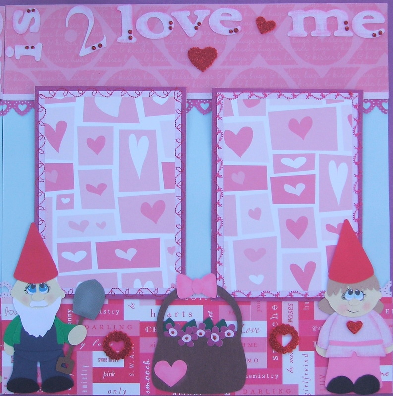 Here is my project. This is a two page scrapbook layout. It features the 'gnomes' pattern set from Designs on Cloud 9.